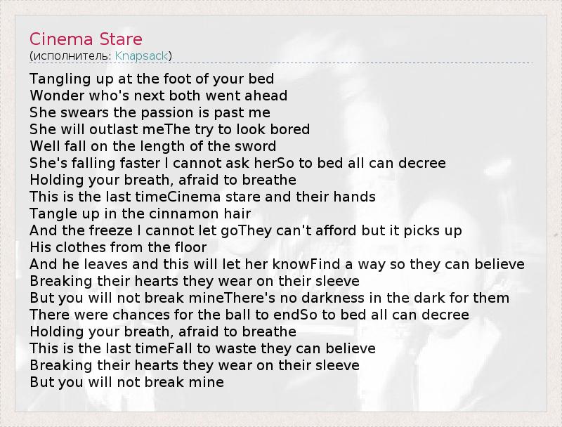 Tangling up at the foot of your bed Wonder who's next both went ahead She swears the passion is past me She will outlast meThe try to look bored Well fall on the length of the sword She's falling faster I cannot ask herSo to bed all can decree Holding your breath, afraid to breathe This is the last timeCinema stare and their hands Tangle up in the cinnamon hair And the freeze I cannot let goThey can't afford but it picks up His clothes from the floor And he leaves and this will let her knowFind a way so they can believe Breaking their hearts they wear on their sleeve But you will not break mineThere's no darkness in the dark for them There were chances for the ball to endSo to bed all can decree Holding your breath, afraid to breathe This is the last timeFall to waste they can believe Breaking their hearts they wear on their sleeve But you will not break mine