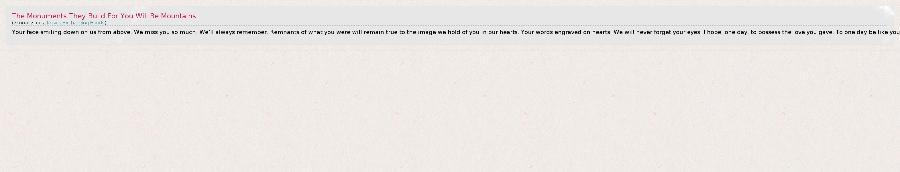 ГлавнаяИсполнителиKnives Exchanging HandsThe Monuments They Build For You Will Be Mountains