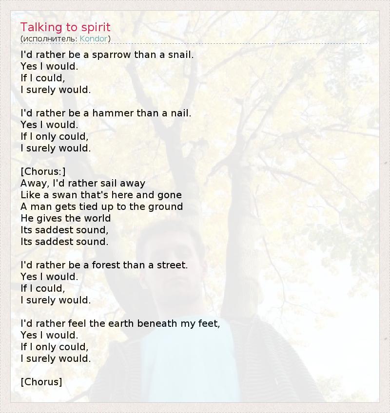 I'd rather be a sparrow than a snail. Yes I would. If I could, I surely would. I'd rather be a hammer than a nail. Yes I would. If I only could, I surely would. [Chorus:] Away, I'd rather sail away Like a swan that's here and gone A man gets tied up to the ground He gives the world Its saddest sound, Its saddest sound. I'd rather be a forest than a street. Yes I would. If I could, I surely would. I'd rather feel the earth beneath my feet, Yes I would. If I only could, I surely would. [Chorus]