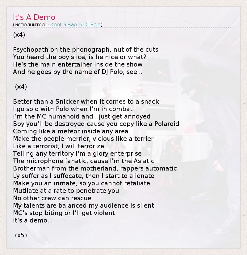 (x4) Psychopath on the phonograph, nut of the cuts You heard the boy slice, is he nice or what? He's the main entertainer inside the show And he goes by the name of DJ Polo, see... (x4) Better than a Snicker when it comes to a snack I go solo with Polo when I'm in combat I'm the MC humanoid and I just get annoyed Boy you'll be destroyed cause you copy like a Polaroid Coming like a meteor inside any area Make the people merrier, vicious like a terrier Like a terrorist, I will terrorize Telling any territory I'm a glory enterprise The microphone fanatic, cause I'm the Asiatic Brotherman from the motherland, rappers automatic Ly suffer as I suffocate, then I start to alienate Make you an inmate, so you cannot retaliate Mutilate at a rate to penetrate you No other crew can rescue My talents are balanced my audience is silent MC's stop biting or I'll get violent It's a demo... (x5)