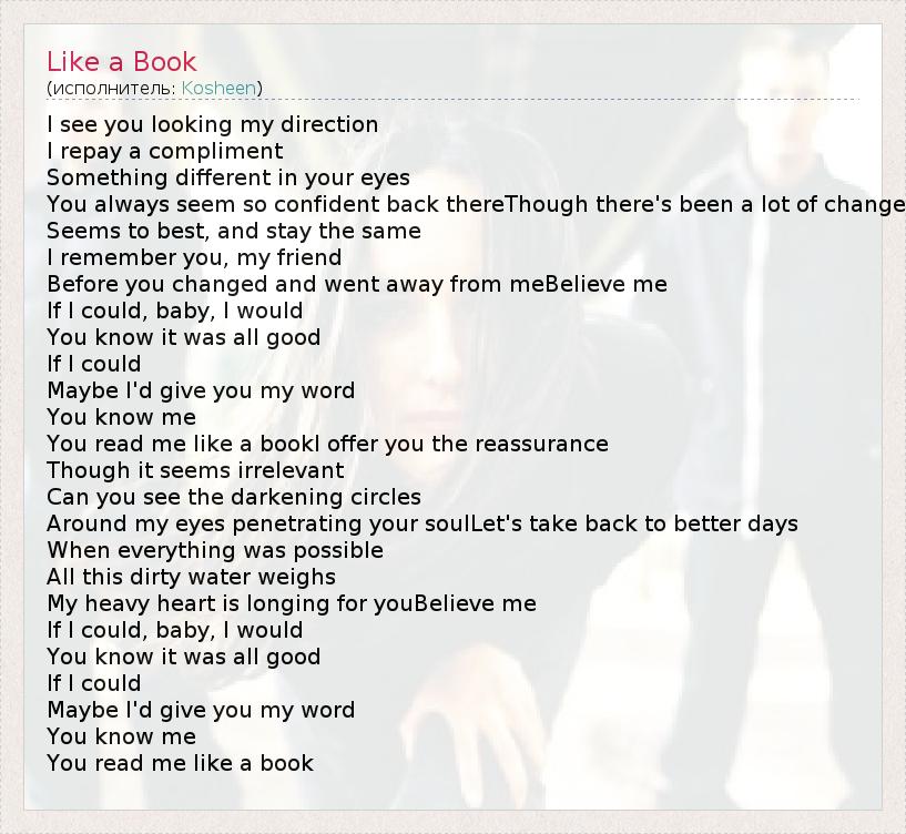 I see you looking my direction I repay a compliment Something different in your eyes You always seem so confident back thereThough there's been a lot of change Seems to best, and stay the same I remember you, my friend Before you changed and went away from meBelieve me If I could, baby, I would You know it was all good If I could Maybe I'd give you my word You know me You read me like a bookI offer you the reassurance Though it seems irrelevant Can you see the darkening circles Around my eyes penetrating your soulLet's take back to better days When everything was possible All this dirty water weighs My heavy heart is longing for youBelieve me If I could, baby, I would You know it was all good If I could Maybe I'd give you my word You know me You read me like a book