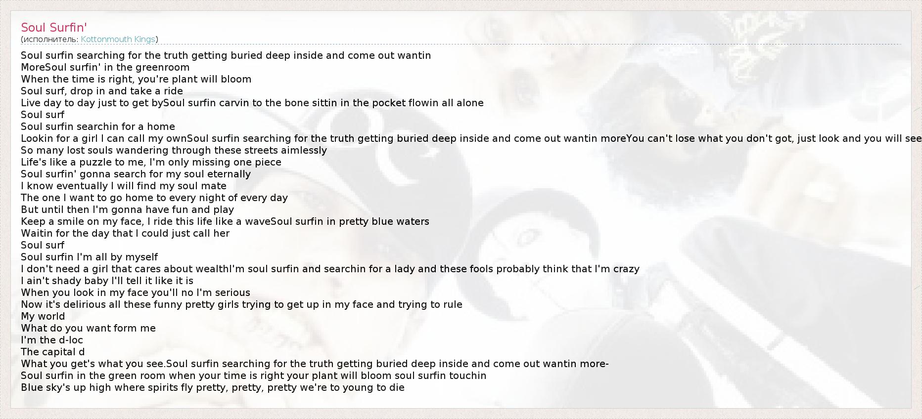 Soul surfin searching for the truth getting buried deep inside and come out wantin MoreSoul surfin' in the greenroom When the time is right, you're plant will bloom Soul surf, drop in and take a ride Live day to day just to get bySoul surfin carvin to the bone sittin in the pocket flowin all alone Soul surf Soul surfin searchin for a home Lookin for a girl I can call my ownSoul surfin searching for the truth getting buried deep inside and come out wantin moreYou can't lose what you don't got, just look and you will see So many lost souls wandering through these streets aimlessly Life's like a puzzle to me, I'm only missing one piece Soul surfin' gonna search for my soul eternally I know eventually I will find my soul mate The one I want to go home to every night of every day But until then I'm gonna have fun and play Keep a smile on my face, I ride this life like a waveSoul surfin in pretty blue waters Waitin for the day that I could just call her Soul surf Soul surfin I'm all by myself I don't need a girl that cares about wealthI'm soul surfin and searchin for a lady and these fools probably think that I'm crazy I ain't shady baby I'll tell it like it is When you look in my face you'll no I'm serious Now it's delirious all these funny pretty girls trying to get up in my face and trying to rule My world What do you want form me I'm the d-loc The capital d What you get's what you see.Soul surfin searching for the truth getting buried deep inside and come out wantin more- Soul surfin in the green room when your time is right your plant will bloom soul surfin touchin Blue sky's up high where spirits fly pretty, pretty, pretty we're to young to die