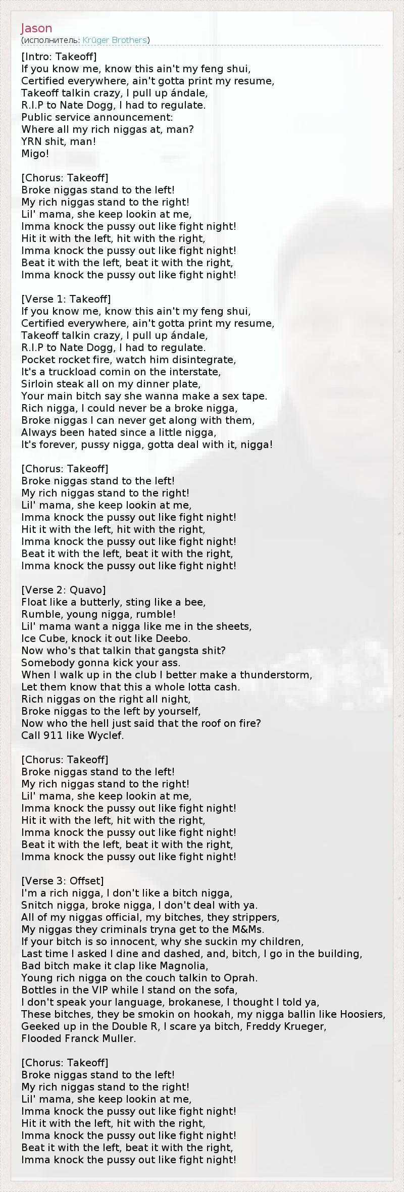 [Вступление: Takeoff] Если вы знаете меня, то знаете, что это не мой фен-шуй, Везде авторитет, мне не нужно распечатывать резюме, У Тэйкоффа безумный базар, я подъезжаю скоренько, Покойся с миром, Нэйт Догг, мне пришлось разруливать. 1 Социальная реклама: Где все мои богатые черномазые, чувак? Тема МБН, чувак! 2 Миго! [Припев: Takeoff] Нищие ниггеры встают слева! Мои богатые ниггеры встают справа! Малая не сводит с меня глаз, Я отправлю её киску в нокаут, как в ночь боёв! Присуну ей слева, присуну ей справа, Я отправлю её киску в нокаут, как в ночь боёв! Вдую ей слева, вдую ей справа, Я отправлю её киску в нокаут, как в ночь боёв! [Куплет 1: Takeoff] Если вы знаете меня, то знаете, что это не мой фен-шуй, Везде авторитет, мне не нужно распечатывать резюме, У Тэйкоффа безумный базар, я подъезжаю скоренько, Покойся с миром, Нэйт Догг, мне пришлось разруливать. Карманная ракета палит, смотрите, как его разрывает, Будто фура едет по шоссе, На моей тарелке сирлоин-стейк, 3 Твоя любимая тёлка говорит, что хочет сняться в домашнем порно со мной. Богатый ниггер, я никогда не смог бы стать бедным ниггером, Нищие ниггеры, я с ними никогда не полажу, Меня ненавидели с самого детства, Это навсегда, ч**шный ниггер, смирись с этим, ниггер! [Припев: Takeoff] Нищие ниггеры встают слева! Мои богатые ниггеры встают справа! Малая не сводит с меня глаз, Я отправлю её киску в нокаут, как в ночь боёв! Присуну ей слева, присуну ей справа, Я отправлю её киску в нокаут, как в ночь боёв! Вдую ей слева, вдую ей справа, Я отправлю её киску в нокаут, как в ночь боёв! [Куплет 2: Quavo] Порхаю как бабочка, жалю как пчела, Сражайся, молодой ниггер, бейся! Малая хочет видеть черномазого, вроде меня, у себя в постели, Айс Кьюб, навешаю ей как Дибо. 4 Кто это там ботает по фене, Кто-нибудь тебе наваляет. Когда я вхожу в клуб, мне лучше устроить грозу, Пусть все знают, что здесь куча наличности. Богатые ниггеры всю ночь справа, Нищие ниггеры всю ночь одни, И кто, чёрт возьми, ляпнул, что крыша загорелась? Вызывайте 911, как Вайклеф. 5 [Припев: Takeoff] Нищие ниггеры встают слева! Мои богатые ниггеры встают справа! Малая не сводит с меня глаз, Я отправлю её киску в нокаут, как в ночь боёв! Присуну ей слева, присуну ей справа, Я отправлю её киску в нокаут, как в ночь боёв! Вдую ей слева, вдую ей справа, Я отправлю её киску в нокаут, как в ночь боёв! [Куплет 3: Offset] Я богатый ниггер, мне не нравятся сс**енные ниггеры, Стукачи, нищие ниггеры, я не связываюсь с вами. Все мои ниггеры официальны, мои с**ки — стриптизёрши, Мои ниггеры — преступники, которые пытаются заработать миллионы. Если твоя тёлка такая невинная, то почему она высасывает из меня детей, В прошлый раз я поел и не заплатил, с**а, я вхожу на вечеринку, Шикарная тёлка хлопает булками, как в Магнолии, 6 Молодой богатый ниггер сидит на диване, беседует с Опрой. 7 В ВИП-зону приносят бутылки, пока я встаю на диван, Я не говорю на твоём языке, по-нищенски, я думал, что уже говорил, Эти с**ки курят кальян, мой ниггер играет как "Хузерс", 8 Накидался в "Роллс-Ройсе", я напугаю твою тёлку как Фредди, 9 "Фрэнк Мюллер" усыпаны бриллиантами. 10 [Припев: Takeoff] Нищие ниггеры встают слева! Мои богатые ниггеры встают справа! Малая не сводит с меня глаз, Я отправлю её киску в нокаут, как в ночь боёв! Присуну ей слева, присуну ей справа, Я отправлю её киску в нокаут, как в ночь боёв! Вдую ей слева, вдую ей справа, Я отправлю её киску в нокаут, 