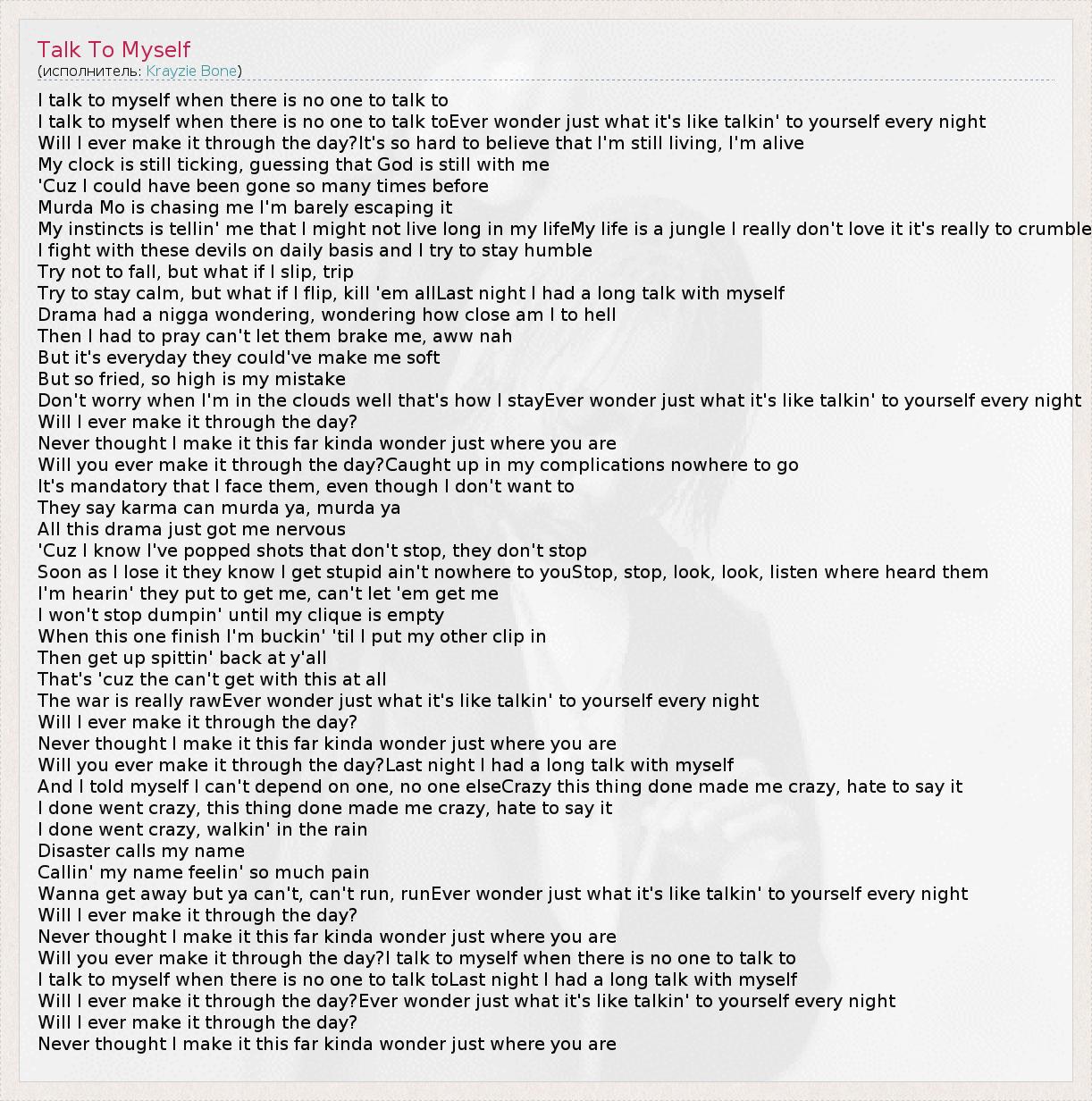 I talk to myself when there is no one to talk to I talk to myself when there is no one to talk toEver wonder just what it's like talkin' to yourself every night Will I ever make it through the day?It's so hard to believe that I'm still living, I'm alive My clock is still ticking, guessing that God is still with me 'Cuz I could have been gone so many times before Murda Mo is chasing me I'm barely escaping it My instincts is tellin' me that I might not live long in my lifeMy life is a jungle I really don't love it it's really to crumble I fight with these devils on daily basis and I try to stay humble Try not to fall, but what if I slip, trip Try to stay calm, but what if I flip, kill 'em allLast night I had a long talk with myself Drama had a nigga wondering, wondering how close am I to hell Then I had to pray can't let them brake me, aww nah But it's everyday they could've make me soft But so fried, so high is my mistake Don't worry when I'm in the clouds well that's how I stayEver wonder just what it's like talkin' to yourself every night Will I ever make it through the day? Never thought I make it this far kinda wonder just where you are Will you ever make it through the day?Caught up in my complications nowhere to go It's mandatory that I face them, even though I don't want to They say karma can murda ya, murda ya All this drama just got me nervous 'Cuz I know I've popped shots that don't stop, they don't stop Soon as I lose it they know I get stupid ain't nowhere to youStop, stop, look, look, listen where heard them I'm hearin' they put to get me, can't let 'em get me I won't stop dumpin' until my clique is empty When this one finish I'm buckin' 'til I put my other clip in Then get up spittin' back at y'all That's 'cuz the can't get with this at all The war is really rawEver wonder just what it's like talkin' to yourself every night Will I ever make it through the day? Never thought I make it this far kinda wonder just where you are Will you ever make it through the day?Last night I had a long talk with myself And I told myself I can't depend on one, no one elseCrazy this thing done made me crazy, hate to say it I done went crazy, this thing done made me crazy, hate to say it I done went crazy, walkin' in the rain Disaster calls my name Callin' my name feelin' so much pain Wanna get away but ya can't, can't run, runEver wonder just what it's like talkin' to yourself every night Will I ever make it through the day? Never thought I make it this far kinda wonder just where you are Will you ever make it through the day?I talk to myself when there is no one to talk to I talk to myself when there is no one to talk toLast night I had a long talk with myself Will I ever make it through the day?Ever wonder just what it's like talkin' to yourself every night Will I ever make it through the day? Never thought I make it this far kinda wonder just where you are