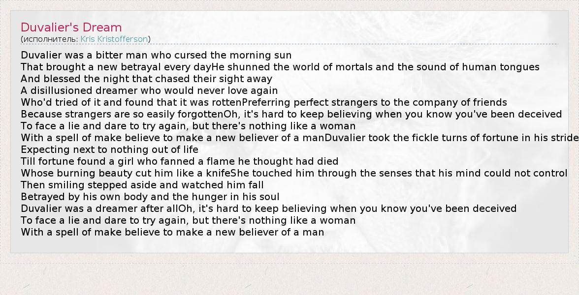 А как ты думаешь, о чем песня "Duvalier's Dream" ?