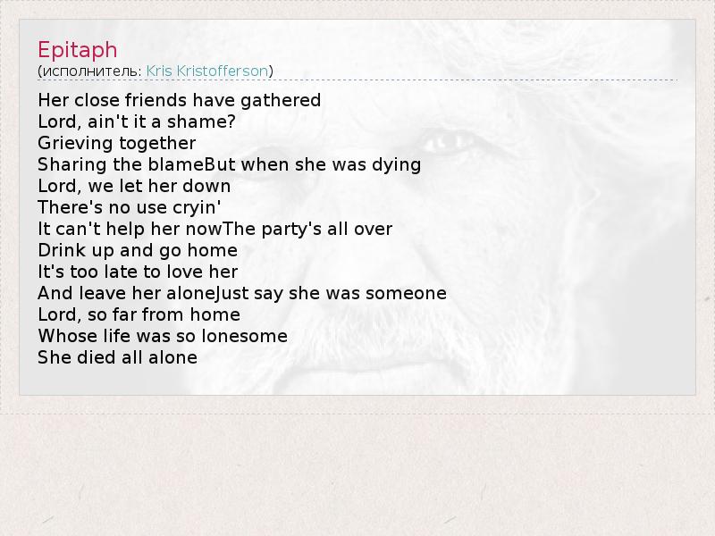 Her close friends have gathered Lord, ain't it a shame? Grieving together Sharing the blameBut when she was dying Lord, we let her down There's no use cryin' It can't help her nowThe party's all over Drink up and go home It's too late to love her And leave her aloneJust say she was someone Lord, so far from home Whose life was so lonesome She died all alone
