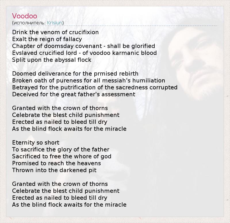 Drink the venom of crucifixion Exalt the reign of fallacy Chapter of doomsday covenant - shall be glorified Evslaved crucified lord - of voodoo karmanic blood Split upon the abyssal flock Doomed deliverance for the prmised rebirth Broken oath of pureness for all messiah's humiliation Betrayed for the putrification of the sacredness corrupted Deceived for the great father's assessment Granted with the crown of thorns Celebrate the blest child punishment Erected as nailed to bleed till dry As the blind flock awaits for the miracle Eternity so short To sacrifice the glory of the father Sacrificed to free the whore of god Promised to reach the heavens Thrown into the darkened pit Granted with the crown of thorns Celebrate the blest child punishment Erected as nailed to bleed till dry As the blind flock awaits for the miracle