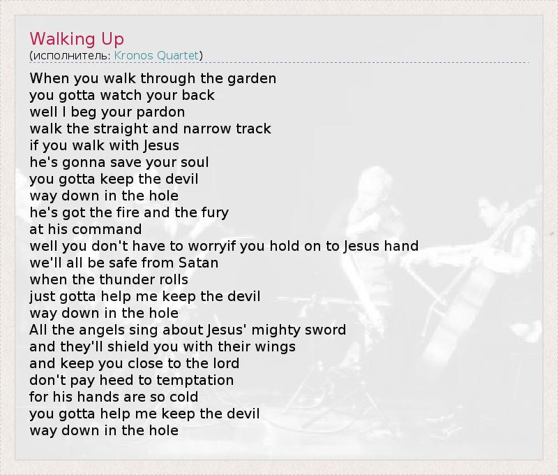 When you walk through the garden you gotta watch your back well I beg your pardon walk the straight and narrow track if you walk with Jesus he's gonna save your soul you gotta keep the devil way down in the hole he's got the fire and the fury at his command well you don't have to worryif you hold on to Jesus hand we'll all be safe from Satan when the thunder rolls just gotta help me keep the devil way down in the hole All the angels sing about Jesus' mighty sword and they'll shield you with their wings and keep you close to the lord don't pay heed to temptation for his hands are so cold you gotta help me keep the devil way down in the hole