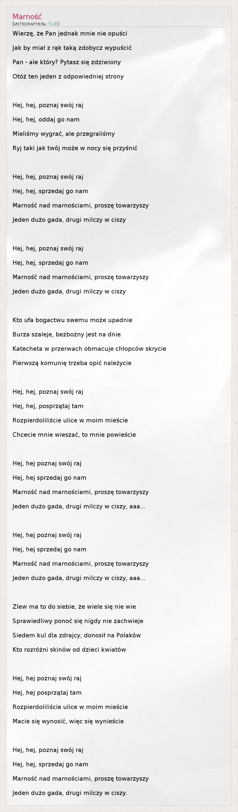 Wierzę, że Pan jednak mnie nie opuści Jak by miał z rąk taką zdobycz wypuścić Pan - ale który? Pytasz się zdziwiony Otóż ten jeden z odpowiedniej strony Hej, hej, poznaj swój raj Hej, hej, oddaj go nam Mieliśmy wygrać, ale przegraliśmy Ryj taki jak twój może w nocy się przyśnić Hej, hej, poznaj swój raj Hej, hej, sprzedaj go nam Marność nad marnościami, proszę towarzyszy Jeden dużo gada, drugi milczy w ciszy Hej, hej, poznaj swój raj Hej, hej, sprzedaj go nam Marność nad marnościami, proszę towarzyszy Jeden dużo gada, drugi milczy w ciszy Kto ufa bogactwu swemu może upadnie Burza szaleje, bezbożny jest na dnie Katecheta w przerwach obmacuje chłopców skrycie Pierwszą komunię trzeba opić należycie Hej, hej, poznaj swój raj Hej, hej, posprzątaj tam Rozpierdoliliście ulice w moim mieście Chcecie mnie wieszać, to mnie powieście Hej, hej poznaj swój raj Hej, hej sprzedaj go nam Marność nad marnościami, proszę towarzyszy Jeden dużo gada, drugi milczy w ciszy, aaa... Hej, hej poznaj swój raj Hej, hej sprzedaj go nam Marność nad marnościami, proszę towarzyszy Jeden dużo gada, drugi milczy w ciszy, aaa... Zlew ma to do siebie, że wiele się nie wie Sprawiedliwy ponoć się nigdy nie zachwieje Siedem kul dla zdrajcy, donosił na Polaków Kto rozróżni skinów od dzieci kwiatów Hej, hej poznaj swój raj Hej, hej posprzątaj tam Rozpierdoliliście ulice w moim mieście Macie się wynosić, więc się wynieście Hej, hej, poznaj swój raj Hej, hej, sprzedaj go nam Marność nad marnościami, proszę towarzyszy Jeden dużo gada, drugi milczy w ciszy.