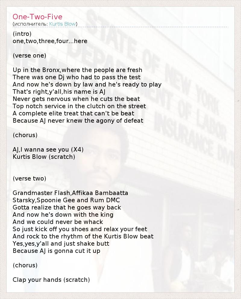 (intro) one,two,three,four...here (verse one) Up in the Bronx,where the people are fresh There was one Dj who had to pass the test And now he's down by law and he's ready to play That's right,y'all,his name is AJ Never gets nervous when he cuts the beat Top notch service in the clutch on the street A complete elite treat that can't be beat Because AJ never knew the agony of defeat (chorus) AJ,I wanna see you (X4) Kurtis Blow (scratch) (verse two) Grandmaster Flash,Affikaa Bambaatta Starsky,Spoonie Gee and Rum DMC Gotta realize that he goes way back And now he's down with the king And we could never be whack So just kick off you shoes and relax your feet And rock to the rhythm of the Kurtis Blow beat Yes,yes,y'all and just shake butt Because AJ is gonna cut it up (chorus) Clap your hands (scratch)