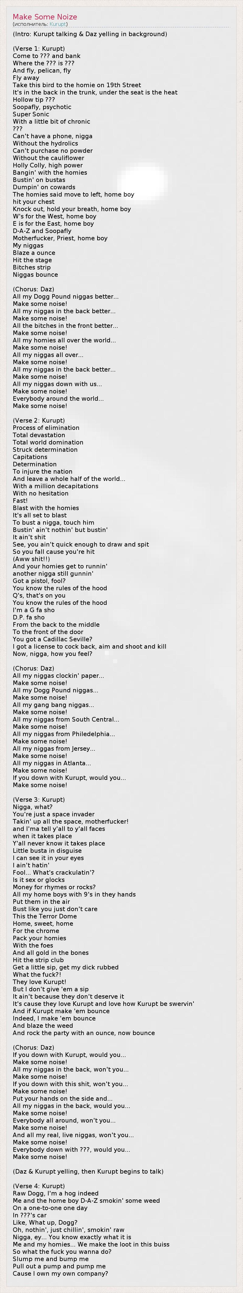 (Intro: Kurupt talking & Daz yelling in background) (Verse 1: Kurupt) Come to ??? and bank Where the ??? is ??? And fly, pelican, fly Fly away Take this bird to the homie on 19th Street It's in the back in the trunk, under the seat is the heat Hollow tip ??? Soopafly, psychotic Super Sonic With a little bit of chronic ??? Can't have a phone, nigga Without the hydrolics Can't purchase no powder Without the cauliflower Holly Colly, high power Bangin' with the homies Bustin' on bustas Dumpin' on cowards The homies said move to left, home boy hit your chest Knock out, hold your breath, home boy W's for the West, home boy E is for the East, home boy D-A-Z and Soopafly Motherfucker, Priest, home boy My niggas Blaze a ounce Hit the stage Bitches strip Niggas bounce (Chorus: Daz) All my Dogg Pound niggas better... Make some noise! All my niggas in the back better... Make some noise! All the bitches in the front better... Make some noise! All my homies all over the world... Make some noise! All my niggas all over... Make some noise! All my niggas in the back better... Make some noise! All my niggas down with us... Make some noise! Everybody around the world... Make some noise! (Verse 2: Kurupt) Process of elimination Total devastation Total world domination Struck determination Capitations Determination To injure the nation And leave a whole half of the world... With a million decapitations With no hesitation Fast! Blast with the homies It's all set to blast To bust a nigga, touch him Bustin' ain't nothin' but bustin' It ain't shit See, you ain't quick enough to draw and spit So you fall cause you're hit (Aww shit!!) And your homies get to runnin' another nigga still gunnin' Got a pistol, fool? You know the rules of the hood Q's, that's on you You know the rules of the hood I'm a G fa sho D.P. fa sho From the back to the middle To the front of the door You got a Cadillac Seville? I got a license to cock back, aim and shoot and kill Now, nigga, how you feel? (Chorus: Daz) All my niggas clockin' paper... Make some noise! All my Dogg Pound niggas... Make some noise! All my gang bang niggas... Make some noise! All my niggas from South Central... Make some noise! All my niggas from Philedelphia... Make some noise! All my niggas from Jersey... Make some noise! All my niggas in Atlanta... Make some noise! If you down with Kurupt, would you... Make some noise! (Verse 3: Kurupt) Nigga, what? You're just a space invader Takin' up all the space, motherfucker! and I'ma tell y'all to y'all faces when it takes place Y'all never know it takes place Little busta in disguise I can see it in your eyes I ain't hatin' Fool... What's crackulatin'? Is it sex or glocks Money for rhymes or rocks? All my home boys with 9's in they hands Put them in the air Bust like you just don't care This the Terror Dome Home, sweet, home For the chrome Pack your homies With the foes And all gold in the bones Hit the strip club Get a little sip, get my dick rubbed What the fuck?! They love Kurupt! But I don't give 'em a sip It ain't because they don't deserve it It's cause they love Kurupt and love how Kurupt be swervin' And if Kurupt make 'em bounce Indeed, I make 'em bounce And blaze the weed And rock the party with an ounce, now bounce (Chorus: Daz) If you down with Kurupt, would you... Make some noise! All my niggas in the back, won't you... Make some noise! If you down with this shit, won't you... Make some noise! Put your hands on the side and... All my niggas in the back, would you... Make some noise! Everybody all around, won't you... Make some noise! And all my real, live niggas, won't you... Make some noise! Everybody down with ???, would you... Make some noise! (Daz & Kurupt yelling, then Kurupt begins to talk) (Verse 4: Kurupt) Raw Dogg, I'm a hog indeed Me and the home boy D-A-Z smokin' some weed On a one-to-one one day In ???'s car Like, What up, Dogg? Oh, nothin', just chillin', smokin' raw Nigga, ey... You know exactly what it is Me and my homies... We make the loot in this buiss So what the fuck you wanna do? Slump me and bump me Pull out a pump and pump me Cause I own my own company?
