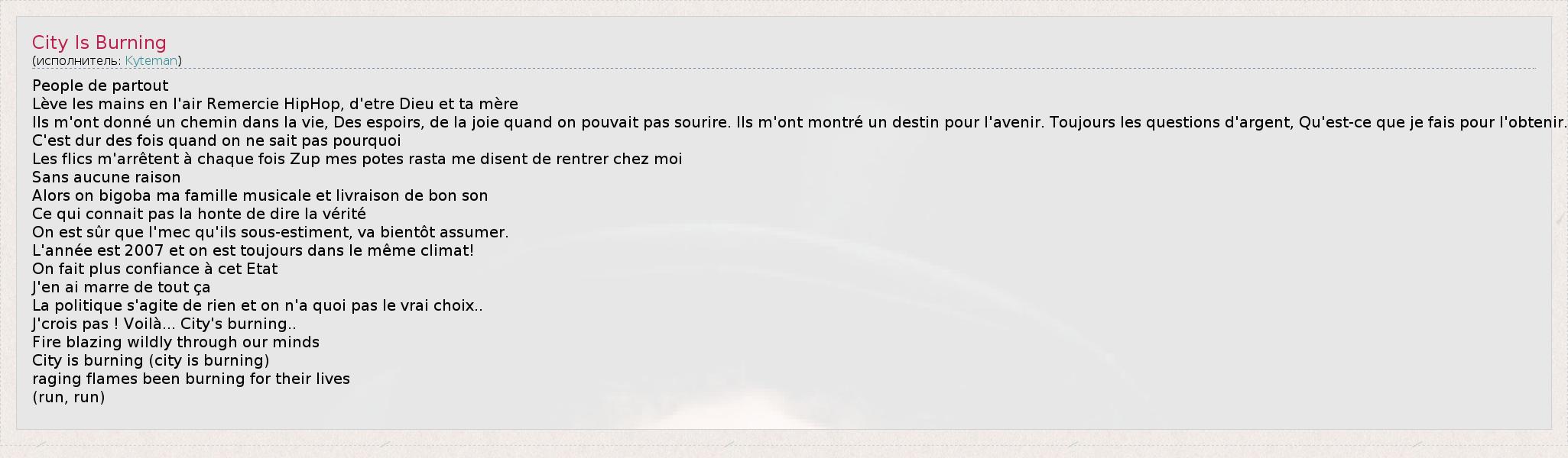People de partout Lève les mains en l'air Remercie HipHop, d'etre Dieu et ta mère Ils m'ont donné un chemin dans la vie, Des espoirs, de la joie quand on pouvait pas sourire. Ils m'ont montré un destin pour l'avenir. Toujours les questions d'argent, Qu'est-ce que je fais pour l'obtenir. C'est dur des fois quand on ne sait pas pourquoi Les flics m'arrêtent à chaque fois Zup mes potes rasta me disent de rentrer chez moi Sans aucune raison Alors on bigoba ma famille musicale et livraison de bon son Ce qui connait pas la honte de dire la vérité On est sûr que l'mec qu'ils sous-estiment, va bientôt assumer. L'année est 2007 et on est toujours dans le même climat! On fait plus confiance à cet Etat J'en ai marre de tout ça La politique s'agite de rien et on n'a quoi pas le vrai choix.. J'crois pas ! Voilà... City's burning.. Fire blazing wildly through our minds City is burning (city is burning) raging flames been burning for their lives (run, run)