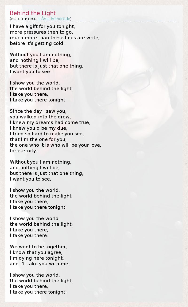 А как ты думаешь, о чем песня "Behind the Light" ?