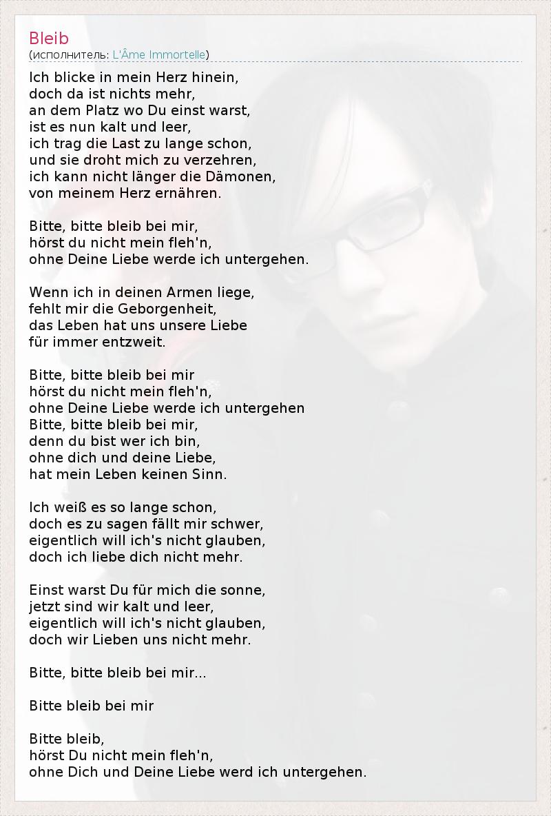 Ich blicke in mein Herz hinein, doch da ist nichts mehr, an dem Platz wo Du einst warst, ist es nun kalt und leer, ich trag die Last zu lange schon, und sie droht mich zu verzehren, ich kann nicht länger die Dämonen, von meinem Herz ernähren. Bitte, bitte bleib bei mir, hörst du nicht mein fleh'n, ohne Deine Liebe werde ich untergehen. Wenn ich in deinen Armen liege, fehlt mir die Geborgenheit, das Leben hat uns unsere Liebe für immer entzweit. Bitte, bitte bleib bei mir hörst du nicht mein fleh'n, ohne Deine Liebe werde ich untergehen Bitte, bitte bleib bei mir, denn du bist wer ich bin, ohne dich und deine Liebe, hat mein Leben keinen Sinn. Ich weiß es so lange schon, doch es zu sagen fällt mir schwer, eigentlich will ich's nicht glauben, doch ich liebe dich nicht mehr. Einst warst Du für mich die sonne, jetzt sind wir kalt und leer, eigentlich will ich's nicht glauben, doch wir Lieben uns nicht mehr. Bitte, bitte bleib bei mir... Bitte bleib bei mir Bitte bleib, hörst Du nicht mein fleh'n, ohne Dich und Deine Liebe werd ich untergehen.