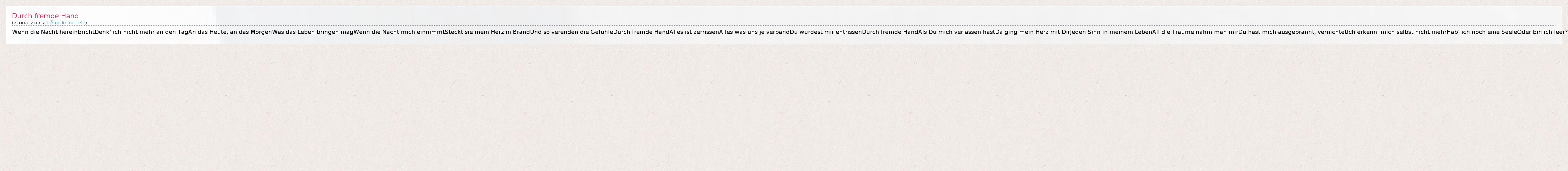 Wenn die Nacht hereinbrichtDenk' ich nicht mehr an den TagAn das Heute, an das MorgenWas das Leben bringen magWenn die Nacht mich einnimmtSteckt sie mein Herz in BrandUnd so verenden die GefühleDurch fremde HandAlles ist zerrissenAlles was uns je verbandDu wurdest mir entrissenDurch fremde HandAls Du mich verlassen hastDa ging mein Herz mit DirJeden Sinn in meinem LebenAll die Träume nahm man mirDu hast mich ausgebrannt, vernichtetIch erkenn' mich selbst nicht mehrHab' ich noch eine SeeleOder bin ich leer?
