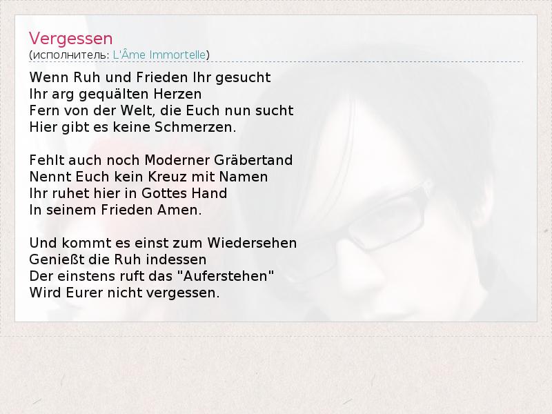 Это интересно:L'Âme Immortelle (фр. бессмертная душа) — австрийская группа, совмещающая в своей музыке электронику и готику. Ранние записи группы тяготели к электронным жанрам EBM и darkwave, на поздних же звучание сместилось в сторону тяжёлого немецкого индастриала (Neue Deutsche Härte).Так же, как и у многих других групп, биография L'Âme Immortelle началась с вечеринки с большим количеством алкоголя. Там познакомились... продолжение