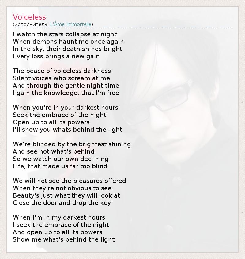 Это интересно:L'Âme Immortelle (фр. бессмертная душа) — австрийская группа, совмещающая в своей музыке электронику и готику. Ранние записи группы тяготели к электронным жанрам EBM и darkwave, на поздних же звучание сместилось в сторону тяжёлого немецкого индастриала (Neue Deutsche Härte).Так же, как и у многих других групп, биография L'Âme Immortelle началась с вечеринки с большим количеством алкоголя. Там познакомились... продолжение
