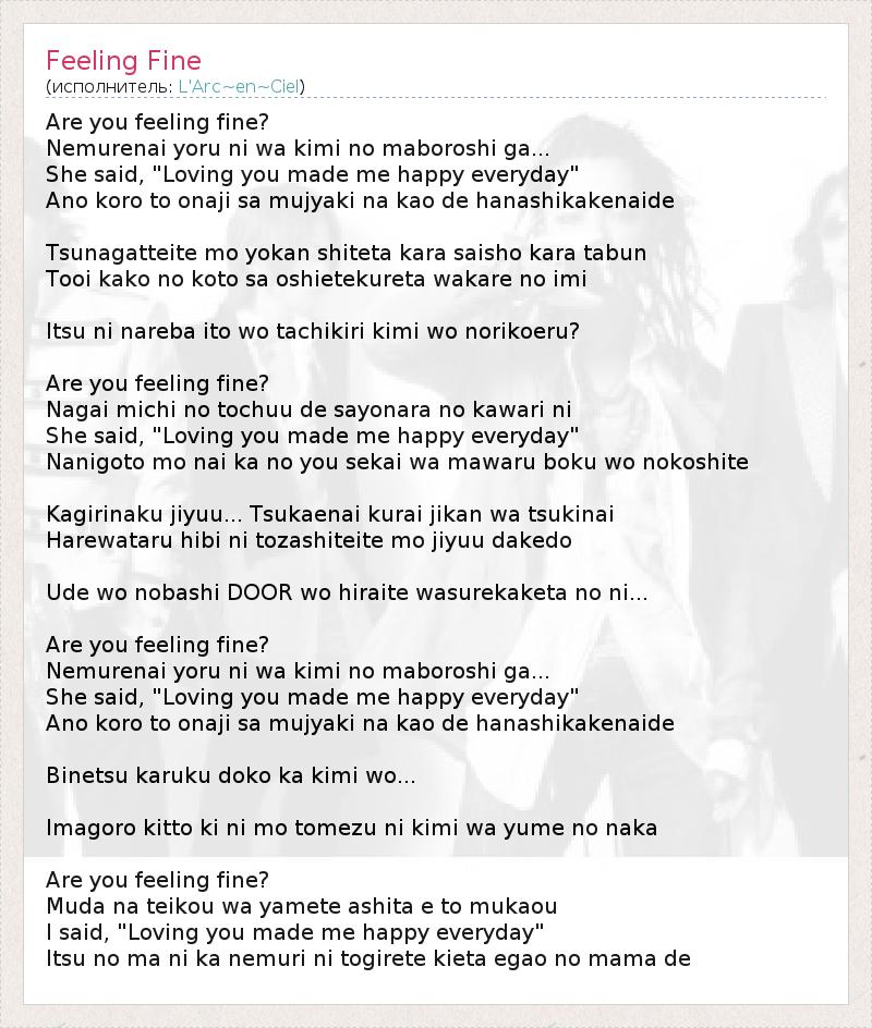 Are you feeling fine? Nemurenai yoru ni wa kimi no maboroshi ga... She said, "Loving you made me happy everyday" Ano koro to onaji sa mujyaki na kao de hanashikakenaide Tsunagatteite mo yokan shiteta kara saisho kara tabun Tooi kako no koto sa oshietekureta wakare no imi Itsu ni nareba ito wo tachikiri kimi wo norikoeru? Are you feeling fine? Nagai michi no tochuu de sayonara no kawari ni She said, "Loving you made me happy everyday" Nanigoto mo nai ka no you sekai wa mawaru boku wo nokoshite Kagirinaku jiyuu... Tsukaenai kurai jikan wa tsukinai Harewataru hibi ni tozashiteite mo jiyuu dakedo Ude wo nobashi DOOR wo hiraite wasurekaketa no ni... Are you feeling fine? Nemurenai yoru ni wa kimi no maboroshi ga... She said, "Loving you made me happy everyday" Ano koro to onaji sa mujyaki na kao de hanashikakenaide Binetsu karuku doko ka kimi wo... Imagoro kitto ki ni mo tomezu ni kimi wa yume no naka Are you feeling fine? Muda na teikou wa yamete ashita e to mukaou I said, "Loving you made me happy everyday" Itsu no ma ni ka nemuri ni togirete kieta egao no mama de