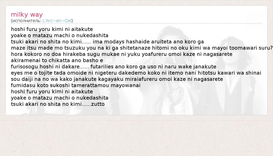 Это интересно:L'Arc~en~Ciel (ラルク アン シエル), L'Arc или Laruku (ラルク?) — популярная японская рок-группа, сформированная в 1991 году. Группа продала более 13 миллионов копий альбомов, 16 миллионов копий синглов, а также миллионы других сборников, например с видеоклипами.«L'Arc-en-Ciel» в переводе с французского означает «радуга». Первоначально в составе группы были Hyde (вокал), Hiro (гитара), Tetsu (бас-гитара), и Pero... продолжение