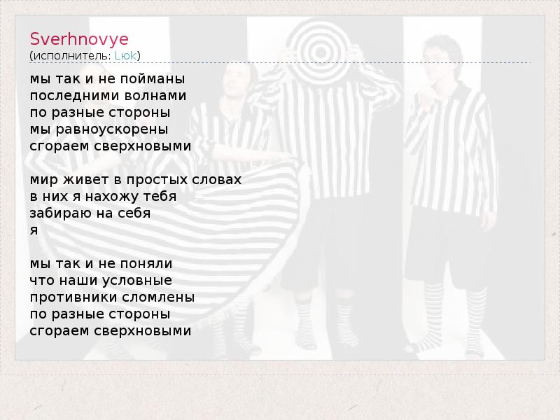 мы так и не пойманы последними волнами по разные стороны мы равноускорены сгораем сверхновыми мир живет в простых словах в них я нахожу тебя забираю на себя я мы так и не поняли что наши условные противники сломлены по разные стороны сгораем сверхновыми