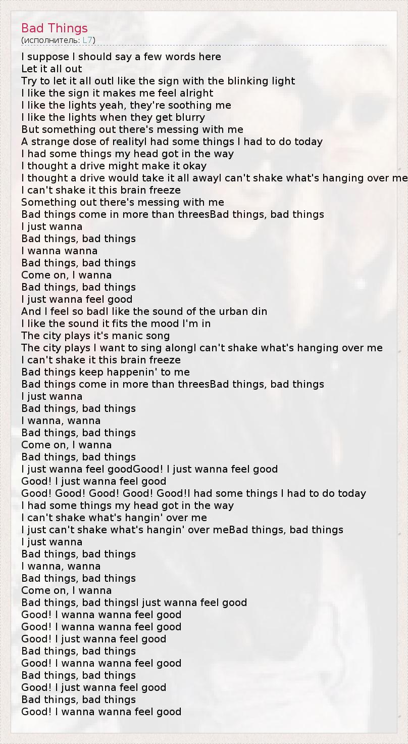 I suppose I should say a few words here Let it all out Try to let it all outI like the sign with the blinking light I like the sign it makes me feel alright I like the lights yeah, they're soothing me I like the lights when they get blurry But something out there's messing with me A strange dose of realityI had some things I had to do today I had some things my head got in the way I thought a drive might make it okay I thought a drive would take it all awayI can't shake what's hanging over me I can't shake it this brain freeze Something out there's messing with me Bad things come in more than threesBad things, bad things I just wanna Bad things, bad things I wanna wanna Bad things, bad things Come on, I wanna Bad things, bad things I just wanna feel good And I feel so badI like the sound of the urban din I like the sound it fits the mood I'm in The city plays it's manic song The city plays I want to sing alongI can't shake what's hanging over me I can't shake it this brain freeze Bad things keep happenin' to me Bad things come in more than threesBad things, bad things I just wanna Bad things, bad things I wanna, wanna Bad things, bad things Come on, I wanna Bad things, bad things I just wanna feel goodGood! I just wanna feel good Good! I just wanna feel good Good! Good! Good! Good! Good!I had some things I had to do today I had some things my head got in the way I can't shake what's hangin' over me I just can't shake what's hangin' over meBad things, bad things I just wanna Bad things, bad things I wanna, wanna Bad things, bad things Come on, I wanna Bad things, bad thingsI just wanna feel good Good! I wanna wanna feel good Good! I wanna wanna feel good Good! I just wanna feel good Bad things, bad things Good! I wanna wanna feel good Bad things, bad things Good! I just wanna feel good Bad things, bad things Good! I wanna wanna feel good