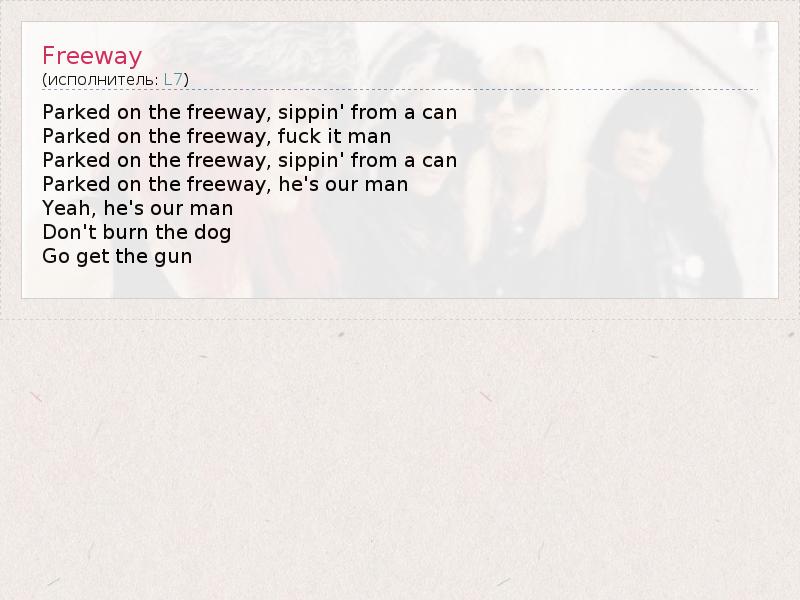 Parked on the freeway, sippin' from a can Parked on the freeway, fuck it man Parked on the freeway, sippin' from a can Parked on the freeway, he's our man Yeah, he's our man Don't burn the dog Go get the gun