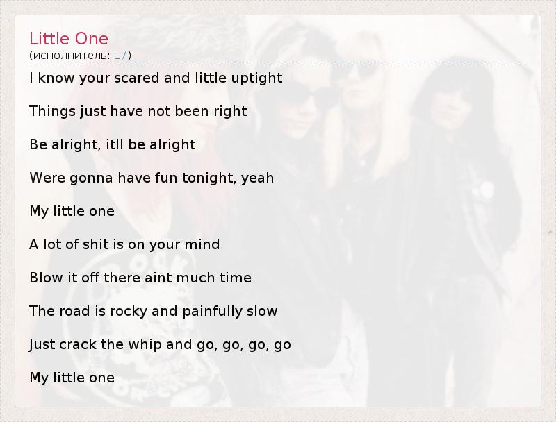 I know your scared and little uptight Things just have not been right Be alright, itll be alright Were gonna have fun tonight, yeah My little one A lot of shit is on your mind Blow it off there aint much time The road is rocky and painfully slow Just crack the whip and go, go, go, go My little one