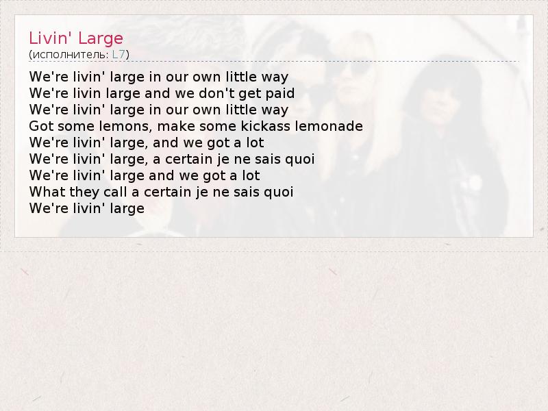 We're livin' large in our own little way We're livin large and we don't get paid We're livin' large in our own little way Got some lemons, make some kickass lemonade We're livin' large, and we got a lot We're livin' large, a certain je ne sais quoi We're livin' large and we got a lot What they call a certain je ne sais quoi We're livin' large