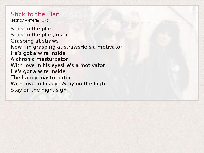 Stick to the plan Stick to the plan, man Grasping at straws Now I'm grasping at strawsHe's a motivator He's got a wire inside A chronic masturbator With love in his eyesHe's a motivator He's got a wire inside The happy masturbator With love in his eyesStay on the high Stay on the high, sigh