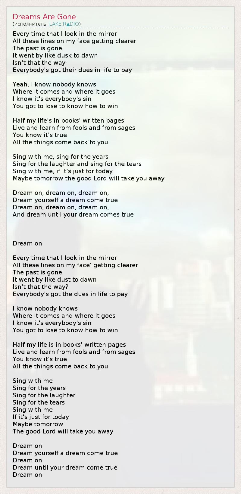 Every time that I look in the mirror All these lines on my face getting clearer The past is gone It went by like dusk to dawn Isn't that the way Everybody's got their dues in life to pay Yeah, I know nobody knows Where it comes and where it goes I know it's everybody's sin You got to lose to know how to win Half my life's in books' written pages Live and learn from fools and from sages You know it's true All the things come back to you Sing with me, sing for the years Sing for the laughter and sing for the tears Sing with me, if it's just for today Maybe tomorrow the good Lord will take you away Dream on, dream on, dream on, Dream yourself a dream come true Dream on, dream on, dream on, And dream until your dream comes true Dream on Every time that I look in the mirror All these lines on my face' getting clearer The past is gone It went by like dust to dawn Isn't that the way? Everybody's got the dues in life to pay I know nobody knows Where it comes and where it goes I know it's everybody's sin You got to lose to know how to win Half my life is in books' written pages Live and learn from fools and from sages You know it's true All the things come back to you Sing with me Sing for the years Sing for the laughter Sing for the tears Sing with me If it's just for today Maybe tomorrow The good Lord will take you away Dream on Dream yourself a dream come true Dream on Dream until your dream come true Dream on