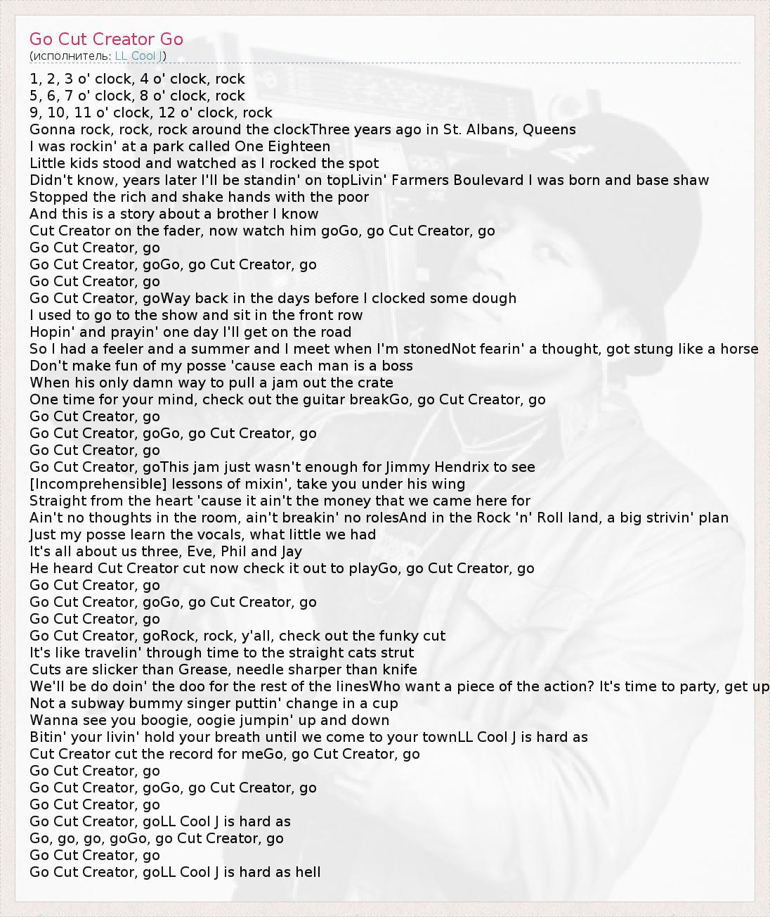 1, 2, 3 o' clock, 4 o' clock, rock 5, 6, 7 o' clock, 8 o' clock, rock 9, 10, 11 o' clock, 12 o' clock, rock Gonna rock, rock, rock around the clockThree years ago in St. Albans, Queens I was rockin' at a park called One Eighteen Little kids stood and watched as I rocked the spot Didn't know, years later I'll be standin' on topLivin' Farmers Boulevard I was born and base shaw Stopped the rich and shake hands with the poor And this is a story about a brother I know Cut Creator on the fader, now watch him goGo, go Cut Creator, go Go Cut Creator, go Go Cut Creator, goGo, go Cut Creator, go Go Cut Creator, go Go Cut Creator, goWay back in the days before I clocked some dough I used to go to the show and sit in the front row Hopin' and prayin' one day I'll get on the road So I had a feeler and a summer and I meet when I'm stonedNot fearin' a thought, got stung like a horse Don't make fun of my posse 'cause each man is a boss When his only damn way to pull a jam out the crate One time for your mind, check out the guitar breakGo, go Cut Creator, go Go Cut Creator, go Go Cut Creator, goGo, go Cut Creator, go Go Cut Creator, go Go Cut Creator, goThis jam just wasn't enough for Jimmy Hendrix to see [Incomprehensible] lessons of mixin', take you under his wing Straight from the heart 'cause it ain't the money that we came here for Ain't no thoughts in the room, ain't breakin' no rolesAnd in the Rock 'n' Roll land, a big strivin' plan Just my posse learn the vocals, what little we had It's all about us three, Eve, Phil and Jay He heard Cut Creator cut now check it out to playGo, go Cut Creator, go Go Cut Creator, go Go Cut Creator, goGo, go Cut Creator, go Go Cut Creator, go Go Cut Creator, goRock, rock, y'all, check out the funky cut It's like travelin' through time to the straight cats strut Cuts are slicker than Grease, needle sharper than knife We'll be do doin' the doo for the rest of the linesWho want a piece of the action? It's time to party, get up Not a subway bummy singer puttin' change in a cup Wanna see you boogie, oogie jumpin' up and down Bitin' your livin' hold your breath until we come to your townLL Cool J is hard as Cut Creator cut the record for meGo, go Cut Creator, go Go Cut Creator, go Go Cut Creator, goGo, go Cut Creator, go Go Cut Creator, go Go Cut Creator, goLL Cool J is hard as Go, go, go, goGo, go Cut Creator, go Go Cut Creator, go Go Cut Creator, goLL Cool J is hard as hell