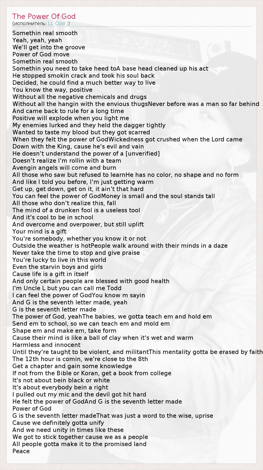 Somethin real smooth Yeah, yeah, yeah We'll get into the groove Power of God move Somethin real smooth Somethin you need to take heed toA base head cleaned up his act He stopped smokin crack and took his soul back Decided, he could find a much better way to live You know the way, positive Without all the negative chemicals and drugs Without all the hangin with the envious thugsNever before was a man so far behind And came back to rule for a long time Positive will explode when you light me My enemies lurked and they held the dagger tightly Wanted to taste my blood but they got scarred When they felt the power of GodWickedness got crushed when the Lord came Down with the King, cause he's evil and vain He doesn't understand the power of a [unverified] Doesn't realize I'm rollin with a team Avengin angels will come and burn All those who saw but refused to learnHe has no color, no shape and no form And like I told you before, I'm just getting warm Get up, get down, get on it, it ain't that hard You can feel the power of GodMoney is small and the soul stands tall All those who don't realize this, fall The mind of a drunken fool is a useless tool And it's cool to be in school And overcome and overpower, but still uplift Your mind is a gift You're somebody, whether you know it or not Outside the weather is hotPeople walk around with their minds in a daze Never take the time to stop and give praise You're lucky to live in this world Even the starvin boys and girls Cause life is a gift in itself And only certain people are blessed with good health I'm Uncle L but you can call me Todd I can feel the power of GodYou know m sayin And G is the seventh letter made, yeah G is the seventh letter made The power of God, yeahThe babies, we gotta teach em and hold em Send em to school, so we can teach em and mold em Shape em and make em, take form Cause their mind is like a ball of clay when it's wet and warm Harmless and innocent Until they're taught to be violent, and militantThis mentality gotta be erased by faith The 12th hour is comin, we're close to the 8th Get a chapter and gain some knowledge If not from the Bible or Koran, get a book from college It's not about bein black or white It's about everybody bein a right I pulled out my mic and the devil got hit hard He felt the power of GodAnd G is the seventh letter made Power of God G is the seventh letter madeThat was just a word to the wise, uprise Cause we definitely gotta unify And we need unity in times like these We got to stick together cause we as a people All people gotta make it to the promised land Peace