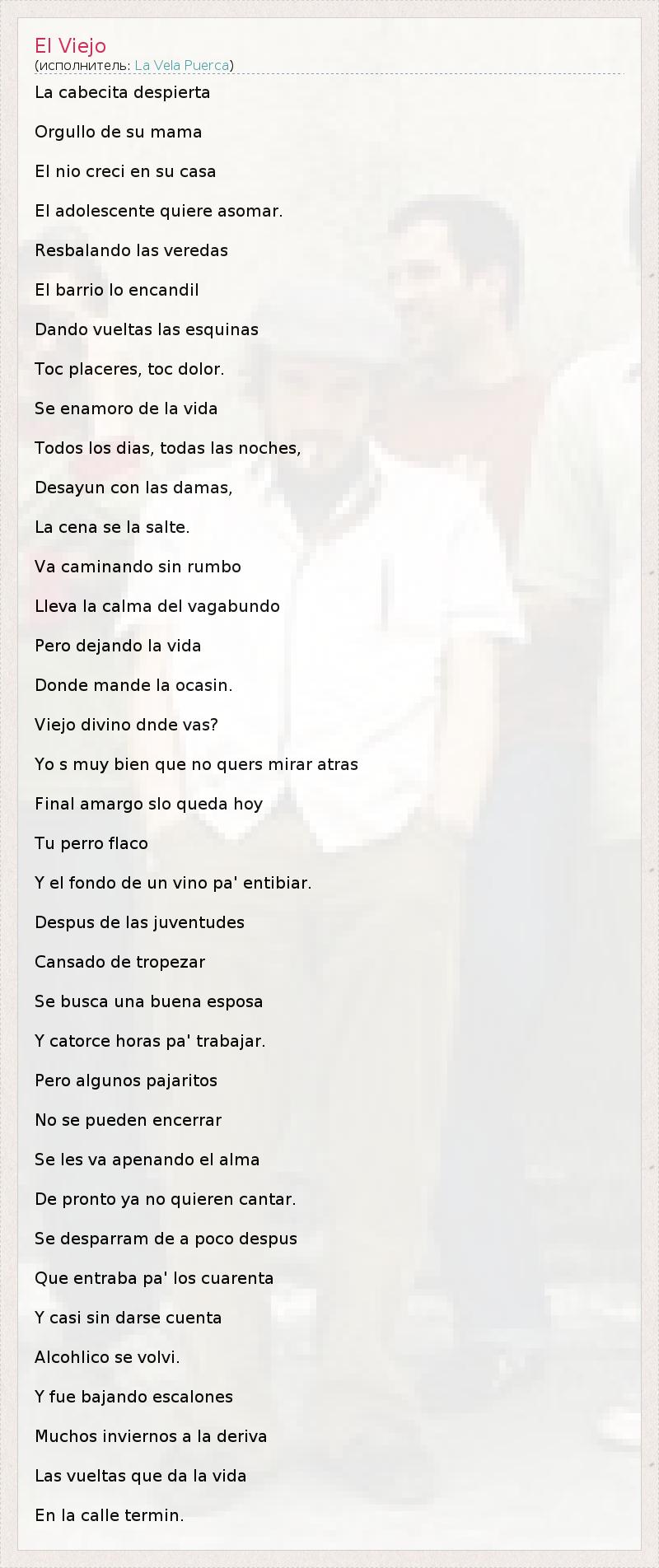 Это интересно:Desorden Público - ска/рок-группа, основанная в 1985 в Каракасе, Венесуэле.Музыка группы - это смесь ска, латиноамериканского рок, регги и народных латиноамериканских мелодий. Социальная лирика группы известна тем, что она комментирует политические события в Венесуэле и в Латинской Америке. Desorden Público использует в своем творчестве различные языки и способствует расовой и социальной терпимости.... продолжение