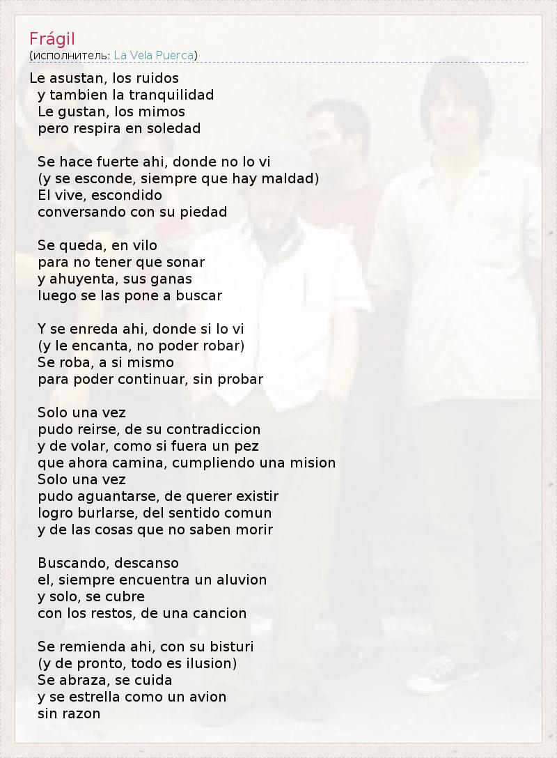 Le asustan, los ruidos y tambien la tranquilidad Le gustan, los mimos pero respira en soledad Se hace fuerte ahi, donde no lo vi (y se esconde, siempre que hay maldad) El vive, escondido conversando con su piedad Se queda, en vilo para no tener que sonar y ahuyenta, sus ganas luego se las pone a buscar Y se enreda ahi, donde si lo vi (y le encanta, no poder robar) Se roba, a si mismo para poder continuar, sin probar Solo una vez pudo reirse, de su contradiccion y de volar, como si fuera un pez que ahora camina, cumpliendo una mision Solo una vez pudo aguantarse, de querer existir logro burlarse, del sentido comun y de las cosas que no saben morir Buscando, descanso el, siempre encuentra un aluvion y solo, se cubre con los restos, de una cancion Se remienda ahi, con su bisturi (y de pronto, todo es ilusion) Se abraza, se cuida y se estrella como un avion sin razon