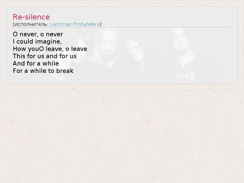 O never, o never I could imagine, How youO leave, o leave This for us and for us And for a while For a while to break