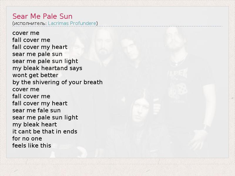 cover me fall cover me fall cover my heart sear me pale sun sear me pale sun light my bleak heartand says wont get better by the shivering of your breath cover me fall cover me fall cover my heart sear me fale sun sear me pale sun light my bleak heart it cant be that in ends for no one feels like this