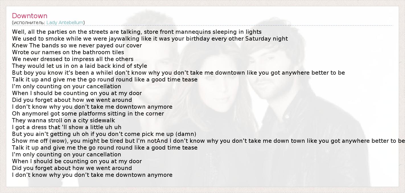 Well, all the parties on the streets are talking, store front mannequins sleeping in lights We used to smoke while we were jaywalking like it was your birthday every other Saturday night Knew The bands so we never payed our cover Wrote our names on the bathroom tiles We never dressed to impress all the others They would let us in on a laid back kind of style But boy you know it's been a whileI don't know why you don't take me downtown like you got anywhere better to be Talk it up and give me the go round round like a good time tease I'm only counting on your cancellation When I should be counting on you at my door Did you forget about how we went around I don't know why you don't take me downtown anymore Oh anymoreI got some platforms sitting in the corner They wanna stroll on a city sidewalk I got a dress that 'll show a little uh uh But you ain't getting uh oh if you don't come pick me up (damn) Show me off (wow), you might be tired but I'm notAnd I don't know why you don't take me down town like you got anywhere better to be Talk it up and give me the go round round like a good time tease I'm only counting on your cancellation When I should be counting on you at my door Did you forget about how we went around I don't know why you don't take me downtown anymore