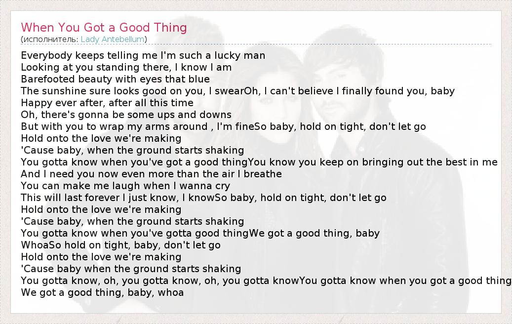 Everybody keeps telling me I'm such a lucky man Looking at you standing there, I know I am Barefooted beauty with eyes that blue The sunshine sure looks good on you, I swearOh, I can't believe I finally found you, baby Happy ever after, after all this time Oh, there's gonna be some ups and downs But with you to wrap my arms around , I'm fineSo baby, hold on tight, don't let go Hold onto the love we're making 'Cause baby, when the ground starts shaking You gotta know when you've got a good thingYou know you keep on bringing out the best in me And I need you now even more than the air I breathe You can make me laugh when I wanna cry This will last forever I just know, I knowSo baby, hold on tight, don't let go Hold onto the love we're making 'Cause baby, when the ground starts shaking You gotta know when you've gotta good thingWe got a good thing, baby WhoaSo hold on tight, baby, don't let go Hold onto the love we're making 'Cause baby when the ground starts shaking You gotta know, oh, you gotta know, oh, you gotta knowYou gotta know when you got a good thing We got a good thing, baby, whoa