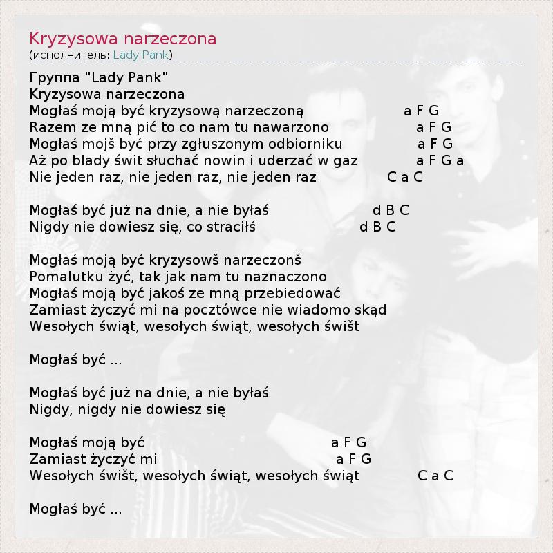 Это интересно:Lady Pank - популярная польская рок-группа. Создана в 1981 году в Варшаве в Яном Борышевичем (Jan Borysewicz) и Анджеем Могилнецким (Andrzej Mogielnicki). Первоначальное название - "Mała Lady Punk" (Маленькая Леди Панк). Одна из наиболее популярных групп в истории польского рока. Состав группы на всем протяжении своего существования часто менялся. Фронтменом и основным вокалистом группы... продолжение