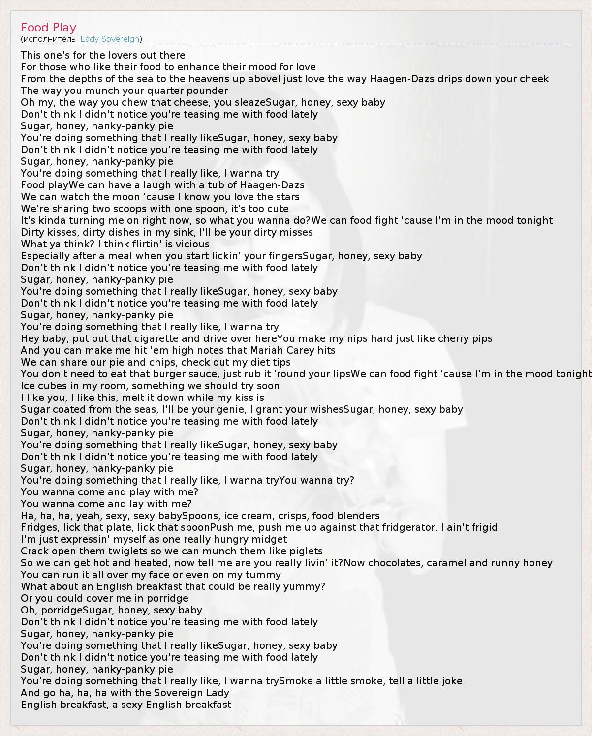 This one's for the lovers out there For those who like their food to enhance their mood for love From the depths of the sea to the heavens up aboveI just love the way Haagen-Dazs drips down your cheek The way you munch your quarter pounder Oh my, the way you chew that cheese, you sleazeSugar, honey, sexy baby Don't think I didn't notice you're teasing me with food lately Sugar, honey, hanky-panky pie You're doing something that I really likeSugar, honey, sexy baby Don't think I didn't notice you're teasing me with food lately Sugar, honey, hanky-panky pie You're doing something that I really like, I wanna try Food playWe can have a laugh with a tub of Haagen-Dazs We can watch the moon 'cause I know you love the stars We're sharing two scoops with one spoon, it's too cute It's kinda turning me on right now, so what you wanna do?We can food fight 'cause I'm in the mood tonight Dirty kisses, dirty dishes in my sink, I'll be your dirty misses What ya think? I think flirtin' is vicious Especially after a meal when you start lickin' your fingersSugar, honey, sexy baby Don't think I didn't notice you're teasing me with food lately Sugar, honey, hanky-panky pie You're doing something that I really likeSugar, honey, sexy baby Don't think I didn't notice you're teasing me with food lately Sugar, honey, hanky-panky pie You're doing something that I really like, I wanna try Hey baby, put out that cigarette and drive over hereYou make my nips hard just like cherry pips And you can make me hit 'em high notes that Mariah Carey hits We can share our pie and chips, check out my diet tips You don't need to eat that burger sauce, just rub it 'round your lipsWe can food fight 'cause I'm in the mood tonight Ice cubes in my room, something we should try soon I like you, I like this, melt it down while my kiss is Sugar coated from the seas, I'll be your genie, I grant your wishesSugar, honey, sexy baby Don't think I didn't notice you're teasing me with food lately Sugar, honey, hanky-panky pie You're doing something that I really likeSugar, honey, sexy baby Don't think I didn't notice you're teasing me with food lately Sugar, honey, hanky-panky pie You're doing something that I really like, I wanna tryYou wanna try? You wanna come and play with me? You wanna come and lay with me? Ha, ha, ha, yeah, sexy, sexy babySpoons, ice cream, crisps, food blenders Fridges, lick that plate, lick that spoonPush me, push me up against that fridgerator, I ain't frigid I'm just expressin' myself as one really hungry midget Crack open them twiglets so we can munch them like piglets So we can get hot and heated, now tell me are you really livin' it?Now chocolates, caramel and runny honey You can run it all over my face or even on my tummy What about an English breakfast that could be really yummy? Or you could cover me in porridge Oh, porridgeSugar, honey, sexy baby Don't think I didn't notice you're teasing me with food lately Sugar, honey, hanky-panky pie You're doing something that I really likeSugar, honey, sexy baby Don't think I didn't notice you're teasing me with food lately Sugar, honey, hanky-panky pie You're doing something that I really like, I wanna trySmoke a little smoke, tell a little joke And go ha, ha, ha with the Sovereign Lady English breakfast, a sexy English breakfast