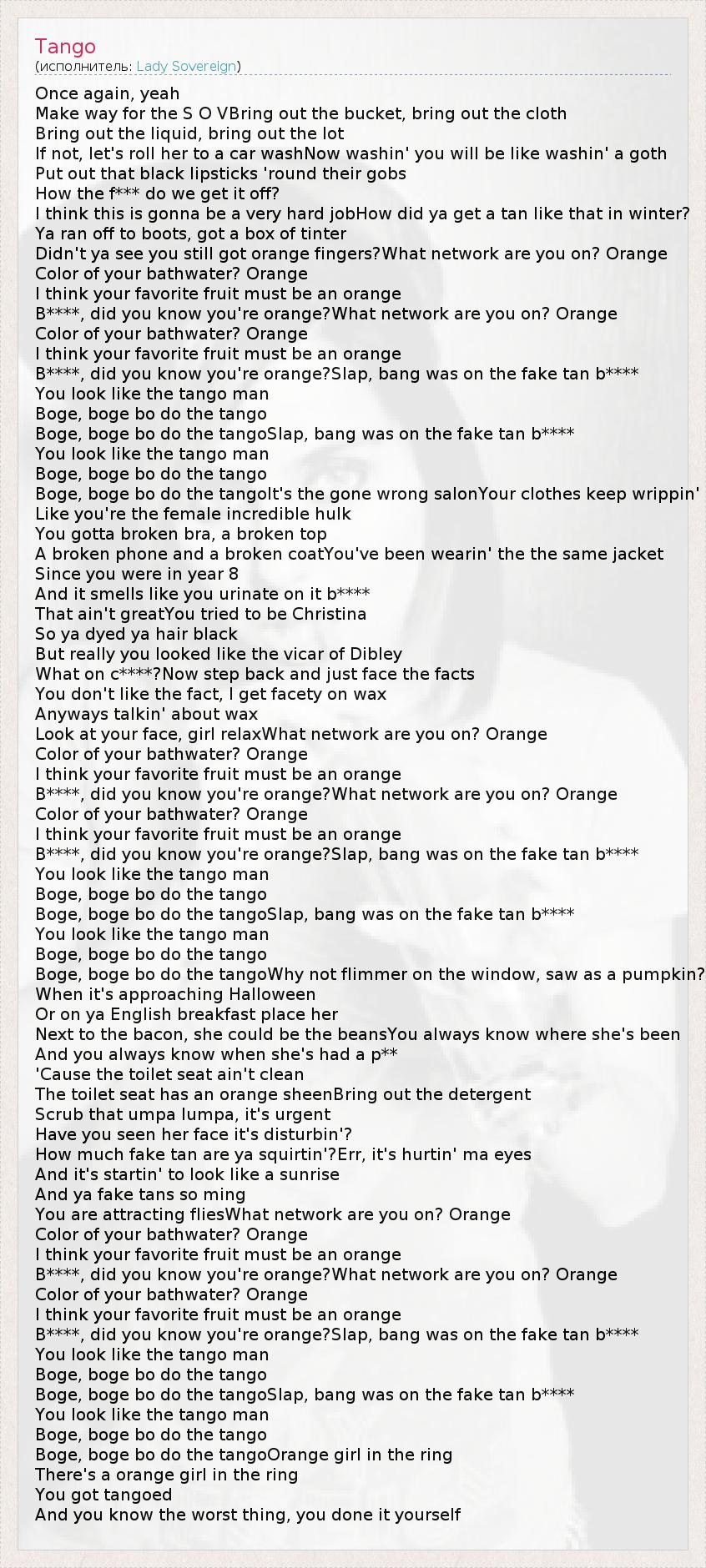 Once again, yeah Make way for the S O VBring out the bucket, bring out the cloth Bring out the liquid, bring out the lot If not, let's roll her to a car washNow washin' you will be like washin' a goth Put out that black lipsticks 'round their gobs How the f*** do we get it off? I think this is gonna be a very hard jobHow did ya get a tan like that in winter? Ya ran off to boots, got a box of tinter Didn't ya see you still got orange fingers?What network are you on? Orange Color of your bathwater? Orange I think your favorite fruit must be an orange B****, did you know you're orange?What network are you on? Orange Color of your bathwater? Orange I think your favorite fruit must be an orange B****, did you know you're orange?Slap, bang was on the fake tan b**** You look like the tango man Boge, boge bo do the tango Boge, boge bo do the tangoSlap, bang was on the fake tan b**** You look like the tango man Boge, boge bo do the tango Boge, boge bo do the tangoIt's the gone wrong salonYour clothes keep wrippin' Like you're the female incredible hulk You gotta broken bra, a broken top A broken phone and a broken coatYou've been wearin' the the same jacket Since you were in year 8 And it smells like you urinate on it b**** That ain't greatYou tried to be Christina So ya dyed ya hair black But really you looked like the vicar of Dibley What on c****?Now step back and just face the facts You don't like the fact, I get facety on wax Anyways talkin' about wax Look at your face, girl relaxWhat network are you on? Orange Color of your bathwater? Orange I think your favorite fruit must be an orange B****, did you know you're orange?What network are you on? Orange Color of your bathwater? Orange I think your favorite fruit must be an orange B****, did you know you're orange?Slap, bang was on the fake tan b**** You look like the tango man Boge, boge bo do the tango Boge, boge bo do the tangoSlap, bang was on the fake tan b**** You look like the tango man Boge, boge bo do the tango Boge, boge bo do the tangoWhy not flimmer on the window, saw as a pumpkin? When it's approaching Halloween Or on ya English breakfast place her Next to the bacon, she could be the beansYou always know where she's been And you always know when she's had a p** 'Cause the toilet seat ain't clean The toilet seat has an orange sheenBring out the detergent Scrub that umpa lumpa, it's urgent Have you seen her face it's disturbin'? How much fake tan are ya squirtin'?Err, it's hurtin' ma eyes And it's startin' to look like a sunrise And ya fake tans so ming You are attracting fliesWhat network are you on? Orange Color of your bathwater? Orange I think your favorite fruit must be an orange B****, did you know you're orange?What network are you on? Orange Color of your bathwater? Orange I think your favorite fruit must be an orange B****, did you know you're orange?Slap, bang was on the fake tan b**** You look like the tango man Boge, boge bo do the tango Boge, boge bo do the tangoSlap, bang was on the fake tan b**** You look like the tango man Boge, boge bo do the tango Boge, boge bo do the tangoOrange girl in the ring There's a orange girl in the ring You got tangoed And you know the worst thing, you done it yourself