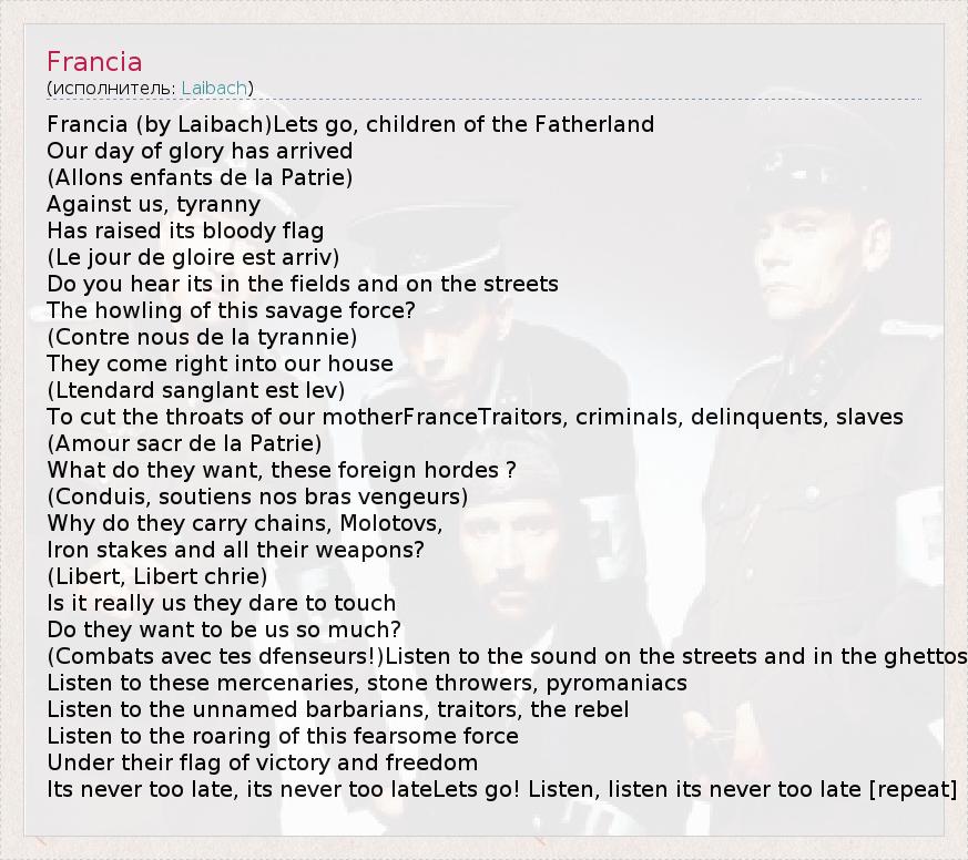 Это интересно:Laibach (Лайбах, нем. Любляна) — словенский музыкальный коллектив, один из самых известных исполнителей, играющих индастриал. В музыке и концертных выступлениях группы присутствуют элементы милитаризма и тоталитаризма.Ансамбль официально образовался 1 июня 1980 года в cловенском городе Трбовле, специализирующемся на добыче угля. В сентябре Laibach приготовил свой первый мультимедийный... продолжение