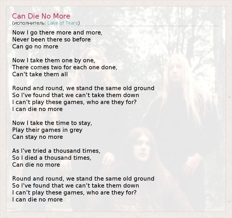 Теперь я иду туда всё чаще и чаще, Раньше я никогда там не был. Не могу больше идти. Теперь я беру их поодиночке, Они идут вдвоём на одного, Не могу побороть их всех. Идём по кругу, мы стоим на той же старой земле И я понял, что нам их не сломить. Я не могу играть в эти игры, кто они такие? Я не могу больше умирать. Сейчас я хочу остаться, И поиграть в их игры незаметно Не могу остановиться. Ведь я пытался тысячу раз, И умирал тысячу раз, Больше не могу умирать. Идём по кругу, мы стоим на той же старой земле И я понял, что нам их не сломить. Я не могу играть в эти игры, кому они нужны? Я не могу больше умирать.