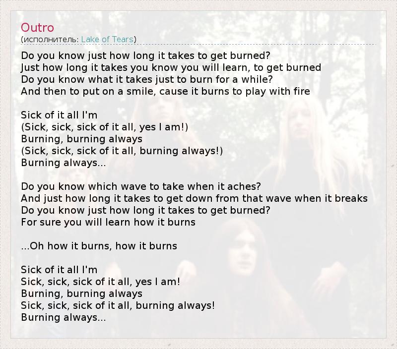 Do you know just how long it takes to get burned? Just how long it takes you know you will learn, to get burned Do you know what it takes just to burn for a while? And then to put on a smile, cause it burns to play with fire Sick of it all I'm (Sick, sick, sick of it all, yes I am!) Burning, burning always (Sick, sick, sick of it all, burning always!) Burning always... Do you know which wave to take when it aches? And just how long it takes to get down from that wave when it breaks Do you know just how long it takes to get burned? For sure you will learn how it burns ...Oh how it burns, how it burns Sick of it all I'm Sick, sick, sick of it all, yes I am! Burning, burning always Sick, sick, sick of it all, burning always! Burning always...