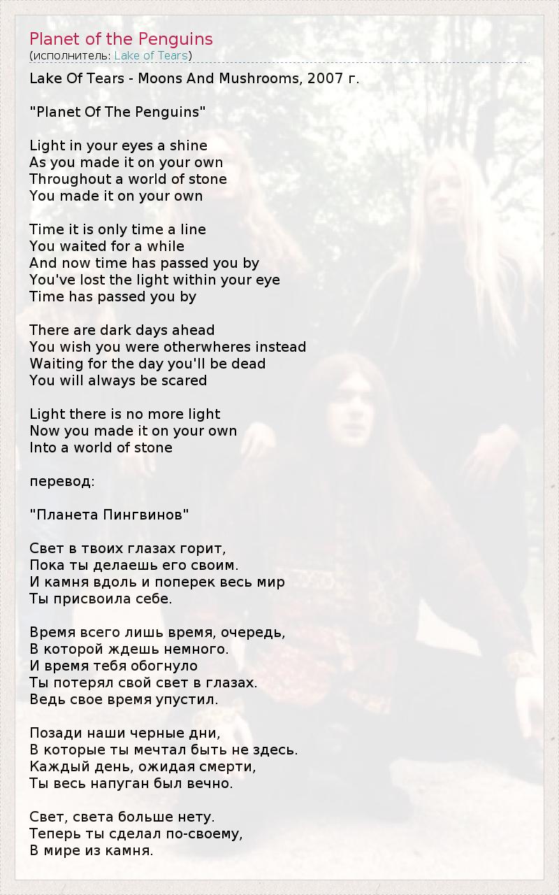Lake Of Tears - Moons And Mushrooms, 2007 г. "Planet Of The Penguins" Light in your eyes a shine As you made it on your own Throughout a world of stone You made it on your own Time it is only time a line You waited for a while And now time has passed you by You've lost the light within your eye Time has passed you by There are dark days ahead You wish you were otherwheres instead Waiting for the day you'll be dead You will always be scared Light there is no more light Now you made it on your own Into a world of stone перевод: "Планета Пингвинов" Свет в твоих глазах горит, Пока ты делаешь его своим. И камня вдоль и поперек весь мир Ты присвоила себе. Время всего лишь время, очередь, В которой ждешь немного. И время тебя обогнуло Ты потерял свой свет в глазах. Ведь свое время упустил. Позади наши черные дни, В которые ты мечтал быть не здесь. Каждый день, ожидая смерти, Ты весь напуган был вечно. Свет, света больше нету. Теперь ты сделал по-своему, В мире из камня.
