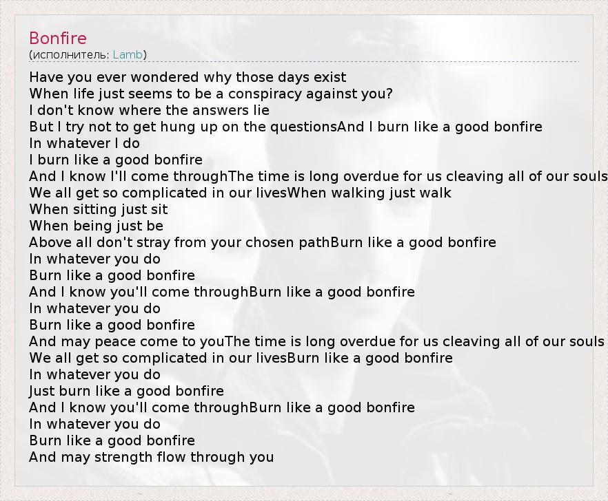 But I try not to get hung up on the questionsAnd I burn like a good bonfire