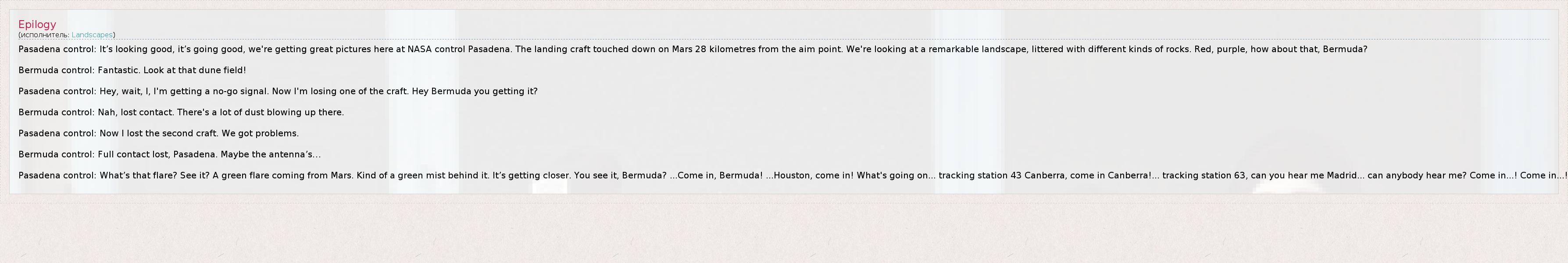 Pasadena control: What’s that flare? See it? A green flare coming from Mars. Kind of a green mist behind it. It’s getting closer. You see it, Bermuda? ...Come in, Bermuda! ...Houston, come in! What's going on... tracking station 43 Canberra, come in Canberra!... tracking station 63, can you hear me Madrid... can anybody hear me? Come in...! Come in...!