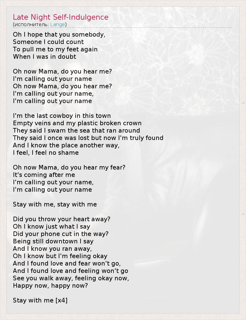 О, я надеюсь, ты та, На кого я могу положиться, Кто вновь поставит меня на ноги После долгих сомнений. О, мама, ты слышишь меня? Я взываю к тебе. О, мама, ты слышишь меня? Я взываю к тебе, Я взываю к тебе. Я - последний подлец 1 в этом городе, С пустыми венами и треснувшей, фальшивой короной. Говорили, что я плавал в море "распутной жизни", 2 Говорили, что однажды я в нём "утонул", а теперь "выплыл". Но я смотрю на это с другой стороны, И мне не стыдно, не стыдно. О, мама, ты чувствуешь мой страх? Он преследует меня, Я взываю к тебе, Я взываю к тебе. Останься со мной, останься со мной. Ты вырвала 3 своё сердце? О, я понимаю, о чём говорю. Твой телефон оборвался? Находясь всё ещё в центре города, я думаю И знаю, что ты ушла. Да, я знаю, но всё в порядке. Я обрёл любовь, но страх не уйдёт. Я обрёл любовь, но чувство не уйдёт. Смотрю, как ты уходишь, чувствуя облегчение. Теперь ты счастлива? Теперь ты счастлива? Останься со мной [х4] 1 - cowboy - это и "ковбой", и "отчаянный/безответственный/безрассудный человек" 2 - дословно: море, что обегало вокруг. To run around - это также "вести распутную жизнь" 3 - дословно: выбросила
