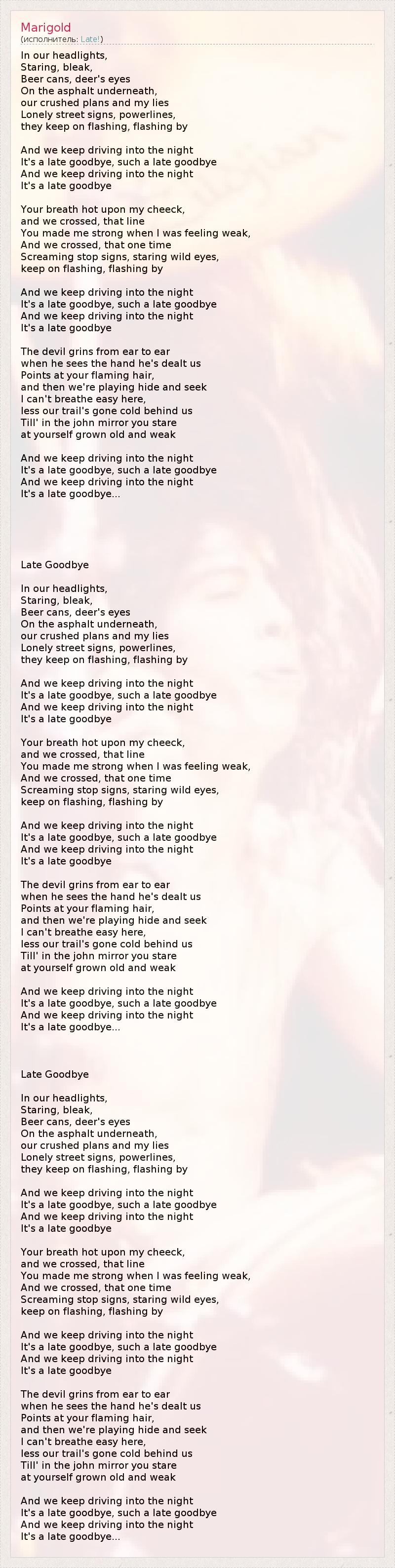 In our headlights, Staring, bleak, Beer cans, deer's eyes On the asphalt underneath, our crushed plans and my lies Lonely street signs, powerlines, they keep on flashing, flashing by And we keep driving into the night It's a late goodbye, such a late goodbye And we keep driving into the night It's a late goodbye Your breath hot upon my cheeck, and we crossed, that line You made me strong when I was feeling weak, And we crossed, that one time Screaming stop signs, staring wild eyes, keep on flashing, flashing by And we keep driving into the night It's a late goodbye, such a late goodbye And we keep driving into the night It's a late goodbye The devil grins from ear to ear when he sees the hand he's dealt us Points at your flaming hair, and then we're playing hide and seek I can't breathe easy here, less our trail's gone cold behind us Till' in the john mirror you stare at yourself grown old and weak And we keep driving into the night It's a late goodbye, such a late goodbye And we keep driving into the night It's a late goodbye... Late Goodbye In our headlights, Staring, bleak, Beer cans, deer's eyes On the asphalt underneath, our crushed plans and my lies Lonely street signs, powerlines, they keep on flashing, flashing by And we keep driving into the night It's a late goodbye, such a late goodbye And we keep driving into the night It's a late goodbye Your breath hot upon my cheeck, and we crossed, that line You made me strong when I was feeling weak, And we crossed, that one time Screaming stop signs, staring wild eyes, keep on flashing, flashing by And we keep driving into the night It's a late goodbye, such a late goodbye And we keep driving into the night It's a late goodbye The devil grins from ear to ear when he sees the hand he's dealt us Points at your flaming hair, and then we're playing hide and seek I can't breathe easy here, less our trail's gone cold behind us Till' in the john mirror you stare at yourself grown old and weak And we keep driving into the night It's a late goodbye, such a late goodbye And we keep driving into the night It's a late goodbye... Late Goodbye In our headlights, Staring, bleak, Beer cans, deer's eyes On the asphalt underneath, our crushed plans and my lies Lonely street signs, powerlines, they keep on flashing, flashing by And we keep driving into the night It's a late goodbye, such a late goodbye And we keep driving into the night It's a late goodbye Your breath hot upon my cheeck, and we crossed, that line You made me strong when I was feeling weak, And we crossed, that one time Screaming stop signs, staring wild eyes, keep on flashing, flashing by And we keep driving into the night It's a late goodbye, such a late goodbye And we keep driving into the night It's a late goodbye The devil grins from ear to ear when he sees the hand he's dealt us Points at your flaming hair, and then we're playing hide and seek I can't breathe easy here, less our trail's gone cold behind us Till' in the john mirror you stare at yourself grown old and weak And we keep driving into the night It's a late goodbye, such a late goodbye And we keep driving into the night It's a late goodbye...