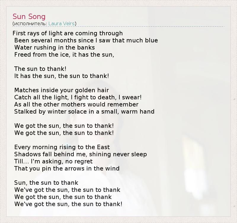 First rays of light are coming through Been several months since I saw that much blue Water rushing in the banks Freed from the ice, it has the sun, The sun to thank! It has the sun, the sun to thank! Matches inside your golden hair Catch all the light, I fight to death, I swear! As all the other mothers would remember Stalked by winter solace in a small, warm hand We got the sun, the sun to thank! We got the sun, the sun to thank! Every morning rising to the East Shadows fall behind me, shining never sleep Till… I'm asking, no regret That you pin the arrows in the wind Sun, the sun to thank We've got the sun, the sun to thank We got the sun, the sun to thank We've got the sun, the sun to thank!